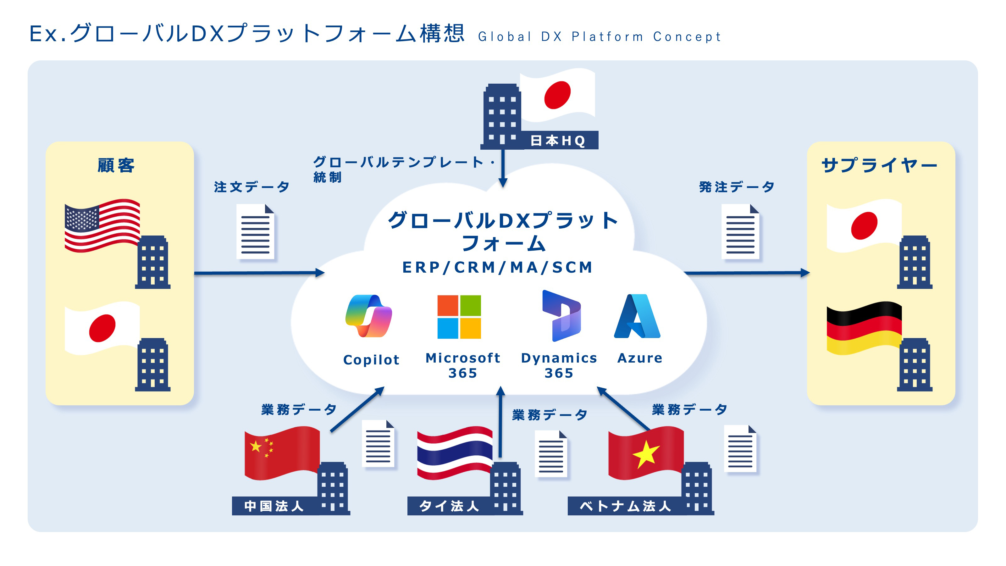 - ERP・CRM統合: Dynamics 365 Finance、Supply Chain Management、Sales、Customer Service、Customer Insights、Contact Center、Field Service、Project Operationsを利用し、受発注、在庫、物流、顧客管理、マーケティングまでグローバルに管理。